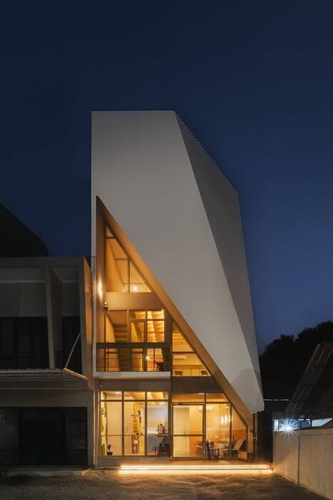 Menjawab kebutuhan tersebut, Delution merancang fasad bangunan dengan geometri segitiga yang tegas, minimalis, dan menciptakan kontras yang kuat di tengah lingkungan sekitarnya. Bentuk ini tidak hanya berfungsi sebagai identitas visual, tetapi juga sebagai penanda ruang yang mudah dikenali. Penggunaan warna putih yang bersih berpadu dengan transparansi kaca, menghadirkan kesan modern, terbuka, sekaligus mengundang pengunjung.
