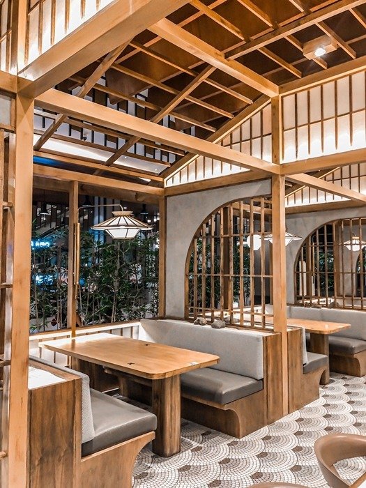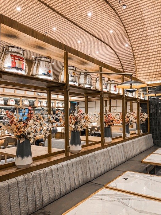 Untuk pilihan dine-in, pengunjung dapat menikmati suasana restoran yang nyaman dengan desain interior khas Jepang seperti material kayu, ornament lampion pada dinding, pohon bambu di setiap sudut ruangan, dan pintu geser sehingga menghadirkan nuansa restoran tradisional di Jepang pada umumnya. Di sisi lain juga terdapat bar untuk meracik aneka sushi dan minuman. Hal ini menjadikan interiornya terasa cozy dan menarik sebagai obyek fotodi sosial media.