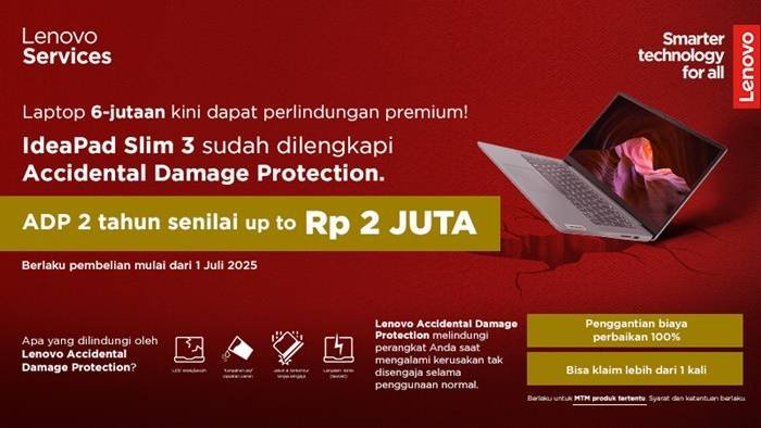 Inisiatif ini menegaskan komitmen Lenovo dalam menghadirkan “Smarter Technology for All” dengan tidak hanya menyediakan perangkat yang terjangkau dan berperforma, tetapi juga memberikan ketenangan pikiran dan perlindungan ekstra bagi penggunanya. Layanan ADP 2 tahun untuk IdeaPad Slim 3 memiliki nilai hingga Rp 2 Juta dan berlaku untuk setiap pembelian mulai 1 Juli 2025,