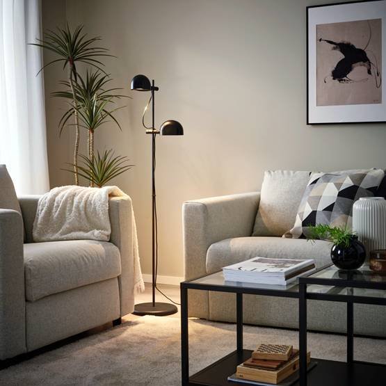 Menempatkan lampu lantai di sudut ruangan dapat membantu mengisi area yang cenderung gelap, sementara pencahayaan dari meja atau lampu gantung menghadirkan fokus visual yang lebih tenang. Sentuhan lembut dari lampu lantai FOLKBÄT, atau aksen cahaya dari seri lampu REMTÄNG, dapat memberikan kesan ruang lebih. Penerangan yang seimbang seperti ini membantu ruang tamu terasa lebih hidup dan nyaman digunakan kapan saja.